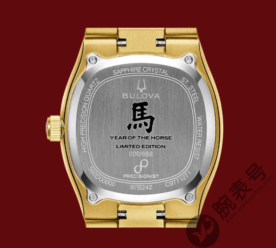 这款腕表采用金色调不锈钢表壳,搭配凹槽硬币边框表圈及同色表链,表盘以红金双色渐变呈现,中央饰有腾跃骏马图案,周围环绕花卉纹饰。3点钟位置设日期窗口,蓝宝石水晶镜面上的放大镜片增强了日期显示清晰度。指针与刻度均涂覆Super-LumiNova夜光涂层,确保夜间清晰读时。为彰显其文化意义,此款腕表限量发行888枚,每枚均附独立编号,暗喻数字“八”的吉祥寓意。动力源自宝路华高性能Precisionist机芯,以卓越精准度与流畅扫秒针著称。